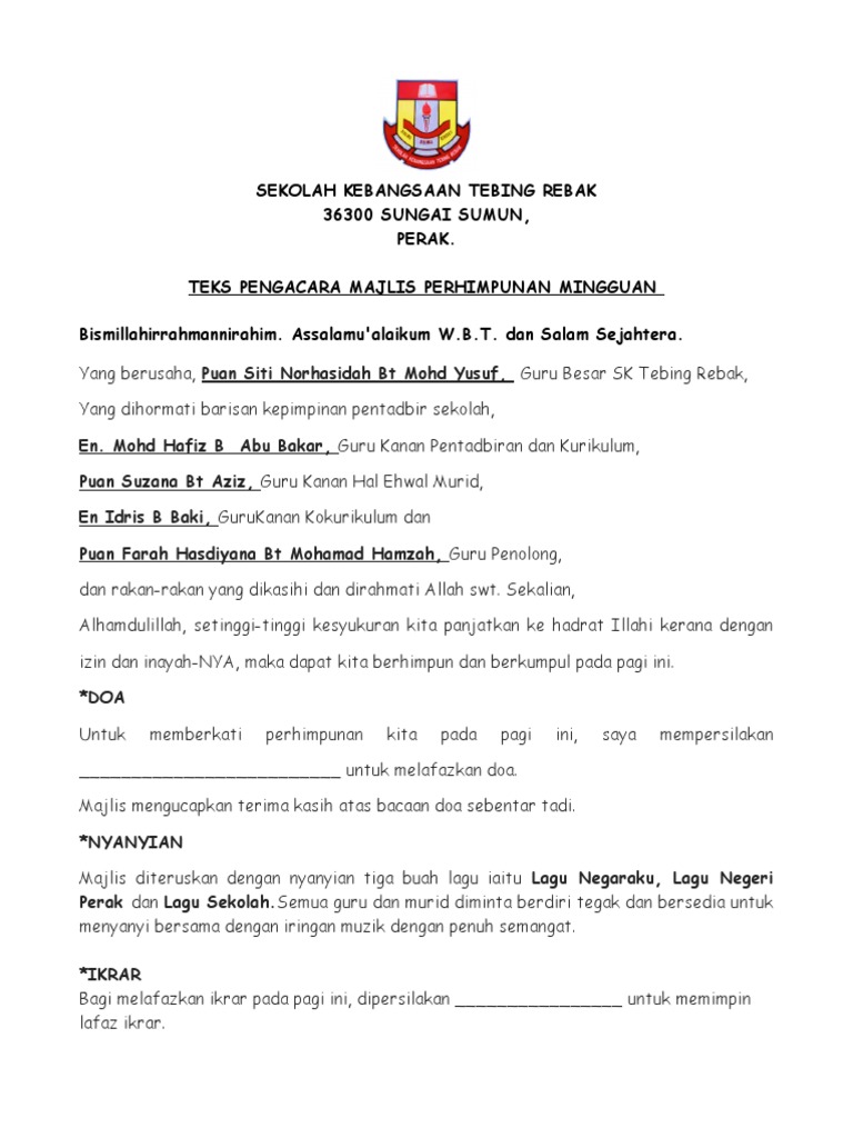 | Lihat Contoh Teks Pengacara Perhimpunan Pagi |